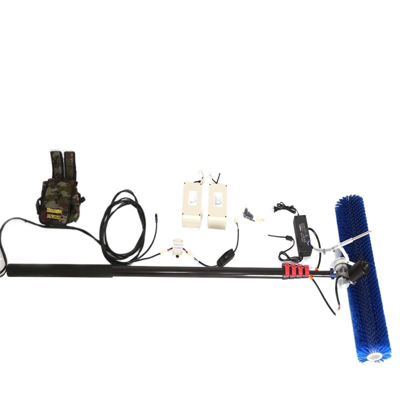 This manual cleaning tool is designed for washing photovoltaic panels. It features a telescopic pole that extends to 7.5 meters and a cleaning head equipped with two rotating nylon brushes. The unit is powered by a 24V lithium battery housed in a portable backpack, allowing for operation without a mains power source. It includes an integrated water pipe for wet cleaning applications.